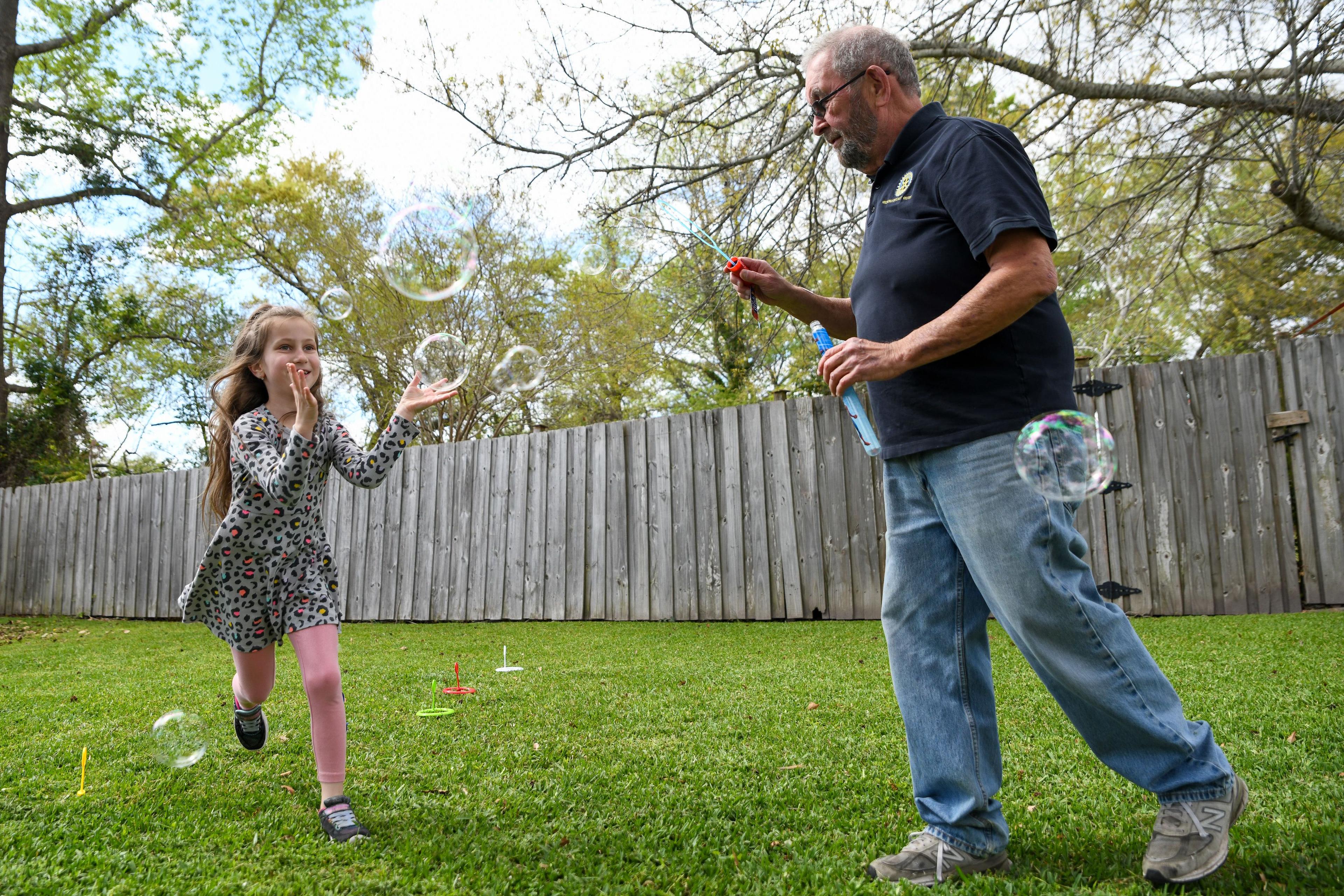 Enjoying a carefree moment, Yeva and Dan play with bubbles in their Wilmington, N.C., yard.
